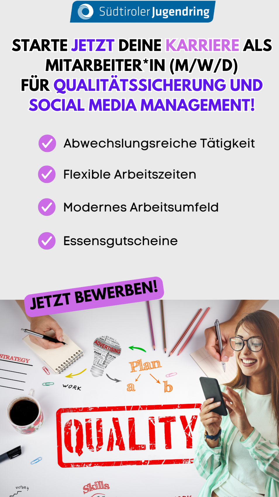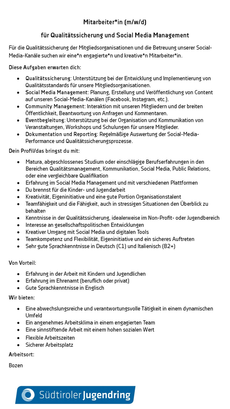 Wenn Du dich für diese spannende Herausforderung begeistern kannst, freuen wir uns auf Deine Bewerbung! Bitte sende die Bewerbungsunterlagen (Lebenslauf und persönliches Motivationsschreiben) innerhalb 30. November 2025 an manuela.weber@jugendring.it.
