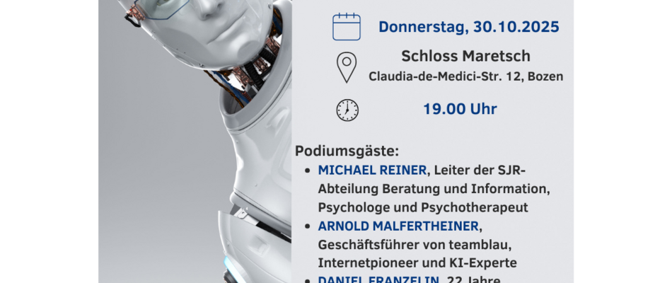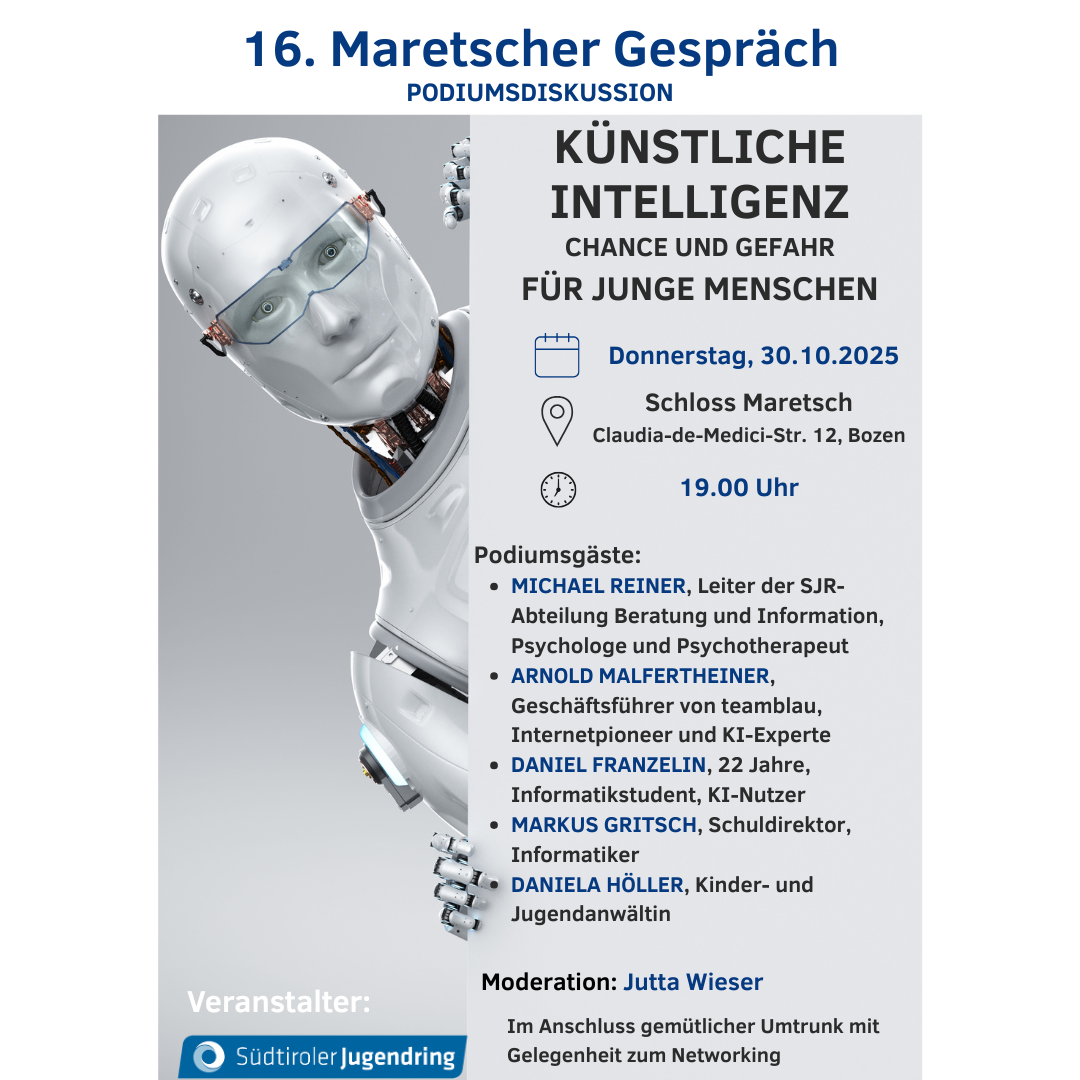 Am Donnerstag, 30.10.2025 hat um 19.00 Uhr im Schloss Maretsch in Bozen das 16. Maretscher Gespräch stattgefunden. Bei dieser Podiumsdiskussion mit dem Titel "Künstliche Intelligenz - Chance und Gefahr für junge Menschen" diskutierten Michael Reiner, Leiter der SJR-Abteilung Beratung und Information, Psychologe und Psychotherapeut, Arnold Malfertheiner, Geschäftsführer von teamblau, Internetpioneer und KI-Experte, Daniel Franzelin, 22 Jahre, Informatikstudent, KI-Nutzer, Markus Gritsch, Schuldirektor, Informatiker, Daniela Höller, Kinder- und Jugendanwältin. Die Moderation hatte Jutta Wieser inne.